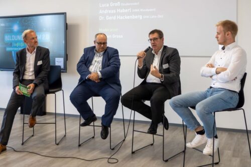 In einer Talkrunde wurden weitere Facetten des Einsatzes von KI beleuchtet. Luca Groß (Viessmann Climate Solutions), dualer Student des Masterstudiengangs „Future Skills und Innovation“, eröffnete die Runde mit der These, dass die Nutzung von KI keine Frage des Alters, sondern der Bereitschaft zum kontinuierlichen Lernen sei. In unserer hochflexiblen Welt sei es nötig, sich auch selbst zu bewegen und neue Skills zu erlernen. Dabei erfordere es aber auch viel Zeit und Geld, um KI erfolgreich in der Praxis zu etablieren. Andreas Haberl, Geschäftsführer der Handwerkskammer Wiesbaden, blickte zuversichtlich in die Zukunft des Handwerks, weil es auch zukünftig Menschen brauchen werde, die etwas mit ihren Händen schafften. „Handwerkliche Tätigkeiten werden durch KI nicht verloren gehen, sondern Unterstützung bekommen.“ Dennoch werde KI auch Handwerksunternehmen nachhaltig verändern. Dr. Gerd Hackenberg, Bereichsleiter Aus- und Weiterbildung der IHK Lahn-Dill, formulierte mit Blick auf die Herausforderung durch KI für Unternehmen zwei Kernaspekte: zum einen die Frage, wie Unternehmen es schafften, neue Aufgaben mit dem Potenzial des vorhandenen Personals zu erledigen. Zum anderen die Herausforderung, wie Unternehmen es schafften, ihre Mitarbeitenden für die Reise in die künstliche Intelligenz zu motivieren, ohne selbst das genaue Ziel zu kennen.