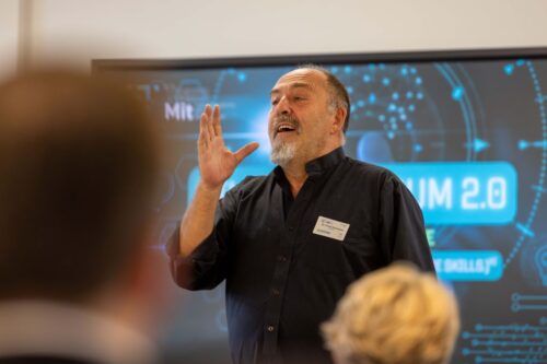 Im letzten Impulsvortrag beleuchtete Dr. Frank Kuhnecke, kybernetischer Psychologe und Kung Fu Großmeister, die Entwicklungsmöglichkeiten und Grenzen von Future Skills. Eine zentrale These, die er aus dem Begriff Kung Fu – intensives Üben – ableitete, lautete: „Wenn wir Skills nicht üben, werden wir nicht besser.“ Das gelte auch für KI, deren sinnvolle Nutzung zu lernen viel Zeit und Raum brauche, um selbstverständlich zu werden. Ein Problem sei dabei, dass wir aktuell zu oft versuchten, die Skills bei Aufgaben vorauszusetzen, statt uns auf einzelne Techniken zu beschränken und diese zu perfektionieren, bevor wir die nächste Herausforderung angingen. Wichtig sei zudem, dass wir über Skills und die zugehörige Haltung für offenen Austausch und Diskussion sorgten, weil nur so Haltungen und Einstellungen sich ändern könnten.